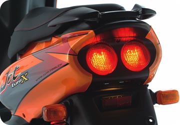 Большой популярностью пользуется серия спортивных скутеров Jet, которые не так давно успешно продавались и на нашем рынке. Модель Jet Euro X имеет литые 12-дюймовые колеса, измененное оформление передней части, двигатель 50-кубовый. Великолепный дизайн приборной панели придется по вкусу любому. Теперь можно четко контролировать скутер не отвлекаясь от дороги, что очень важно, ведь данная модель способна показывать скорость до 70 км\ч, что является удачным выбором для любителей безопасной и комфортной езды. При равномерном движении на средней скорости минимальный расход топлива составляет 2,5 л/ 100 км.